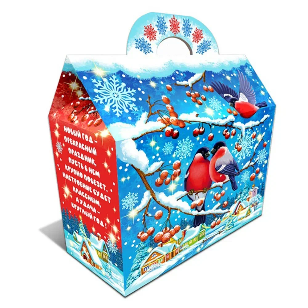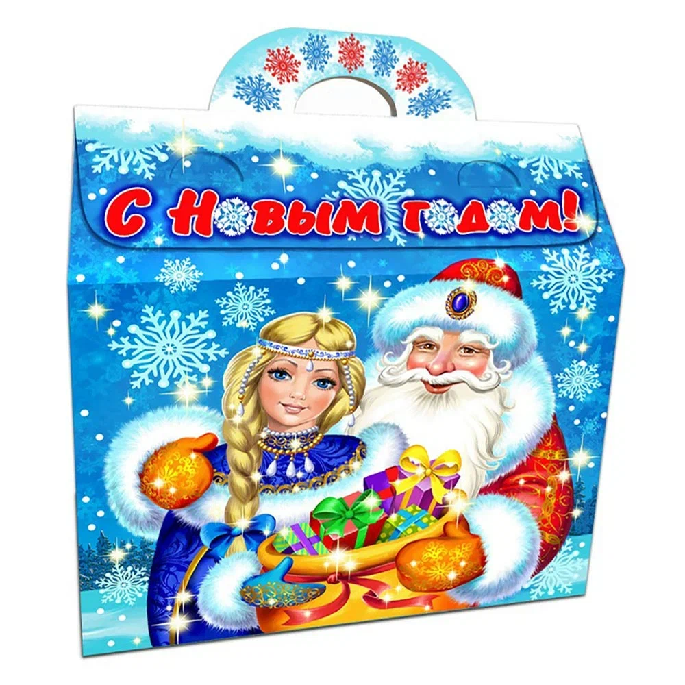 Коробка, украшенная изображениями Деда Мороза и Снегурочки с подарками, оформлена в ярких голубых оттенках с надписью «С Новым годом!».