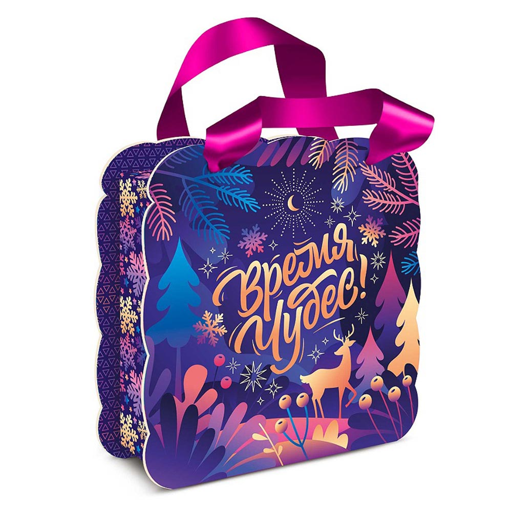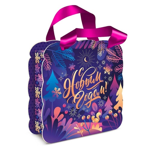 Красивая упаковка в цветах новогодней ночи и фейерверков с иллюстрацией сказочного леса.