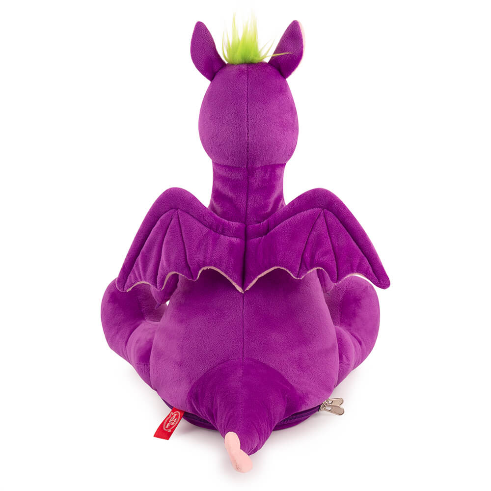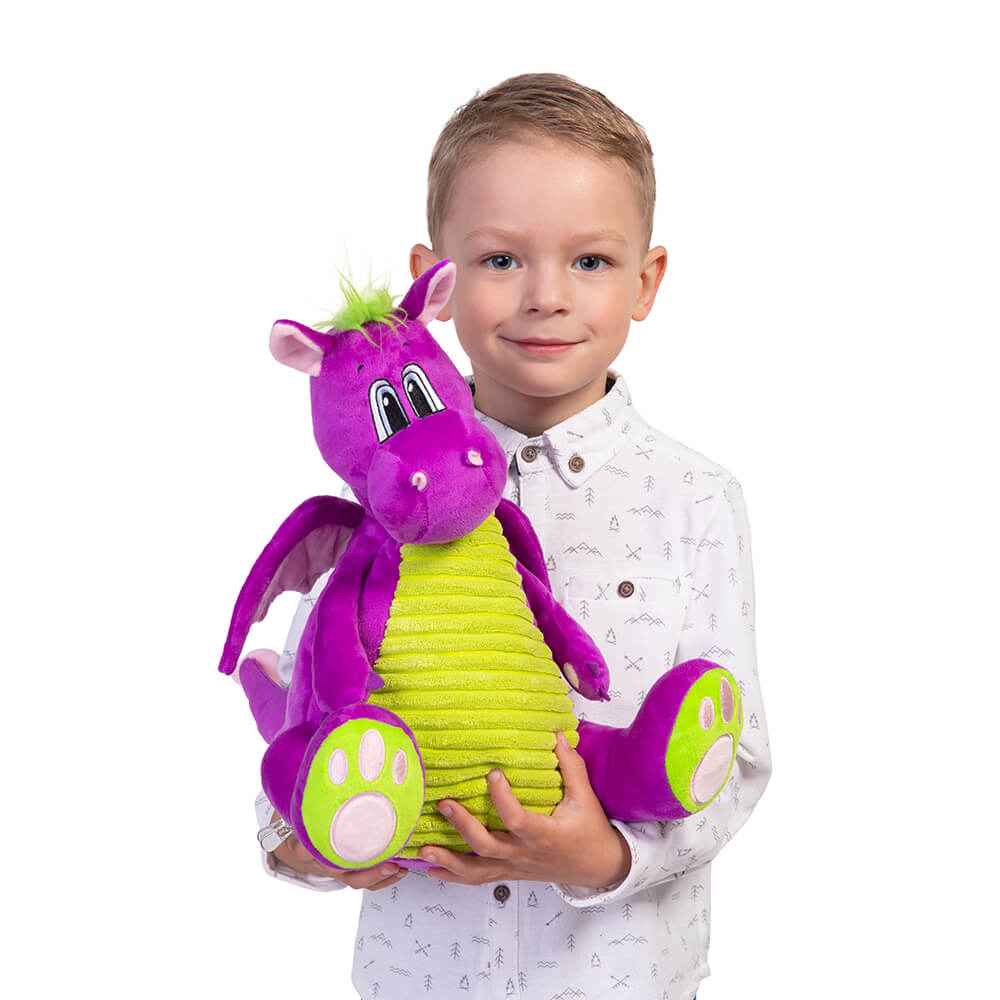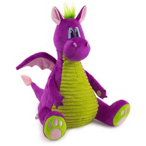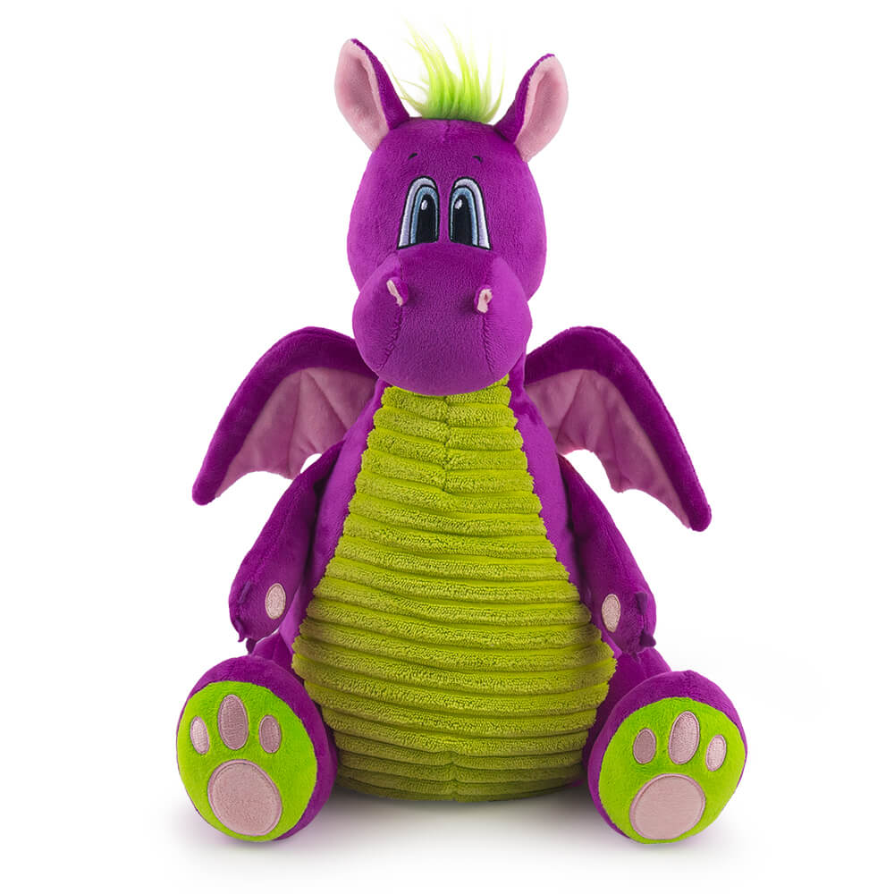 Дракончик Фред выполнен из плюша фиолетового и нежно‑розового цветов с контрастными деталями — зеленым хохолком на голове, брюшком из вельвета в крупный рубчик цвета зеленого яблока и пяточками в тон. Глаза и другие детали сделаны вышивкой.