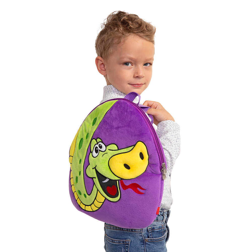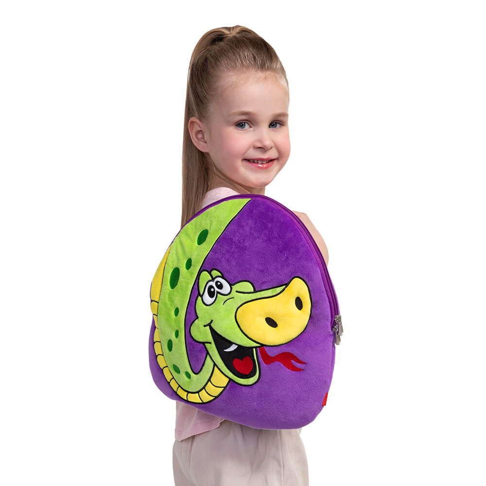 Большой роскошный удав на ярком фиолетовом рюкзачке словно свисает с лианы и желает подружиться! Рюкзак Гордон выполнен из тактильно приятного плюша и украшен аппликацией-вышивкой в виде дружелюбного желто-зеленого удава. У змеи добрые глазки, длинный алый язычок и большой объемный носик.