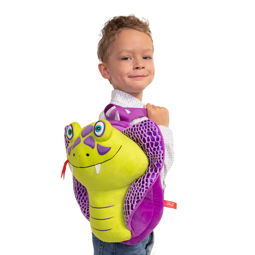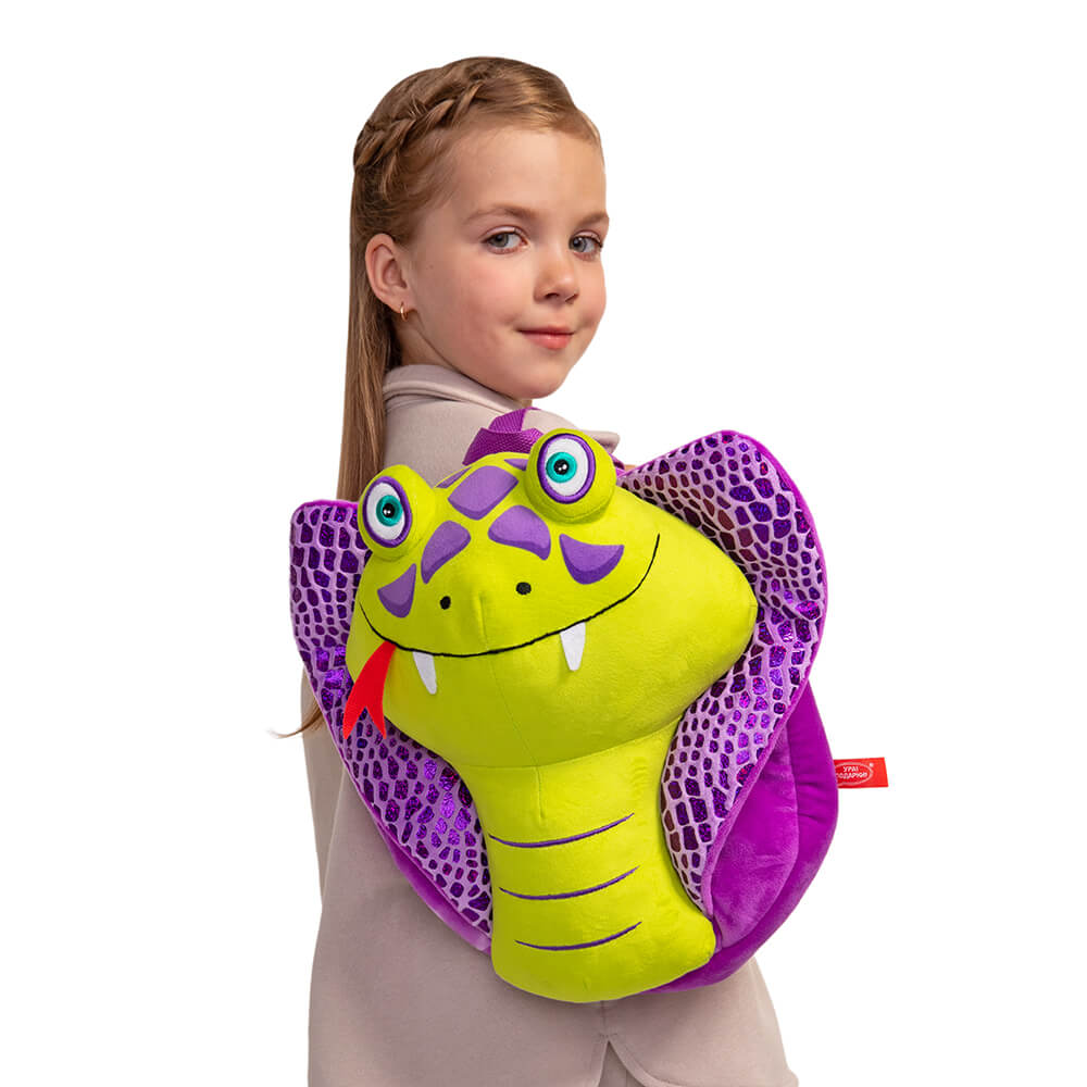 Оригинальный рюкзак Хантер с объемной головой кобры и сладким подарком внутри. Симпатичная улыбающаяся мордочка змеи сшита из текстиля светло-зеленого цвета, с сиреневыми пятнышками на носу. Капюшон кобры выполнен из материала с блестящим узором, имитирующим змеиную чешую. У Хантера изумрудно-зеленые глаза, сделанные вышивкой, алый язычок и белые зубки.