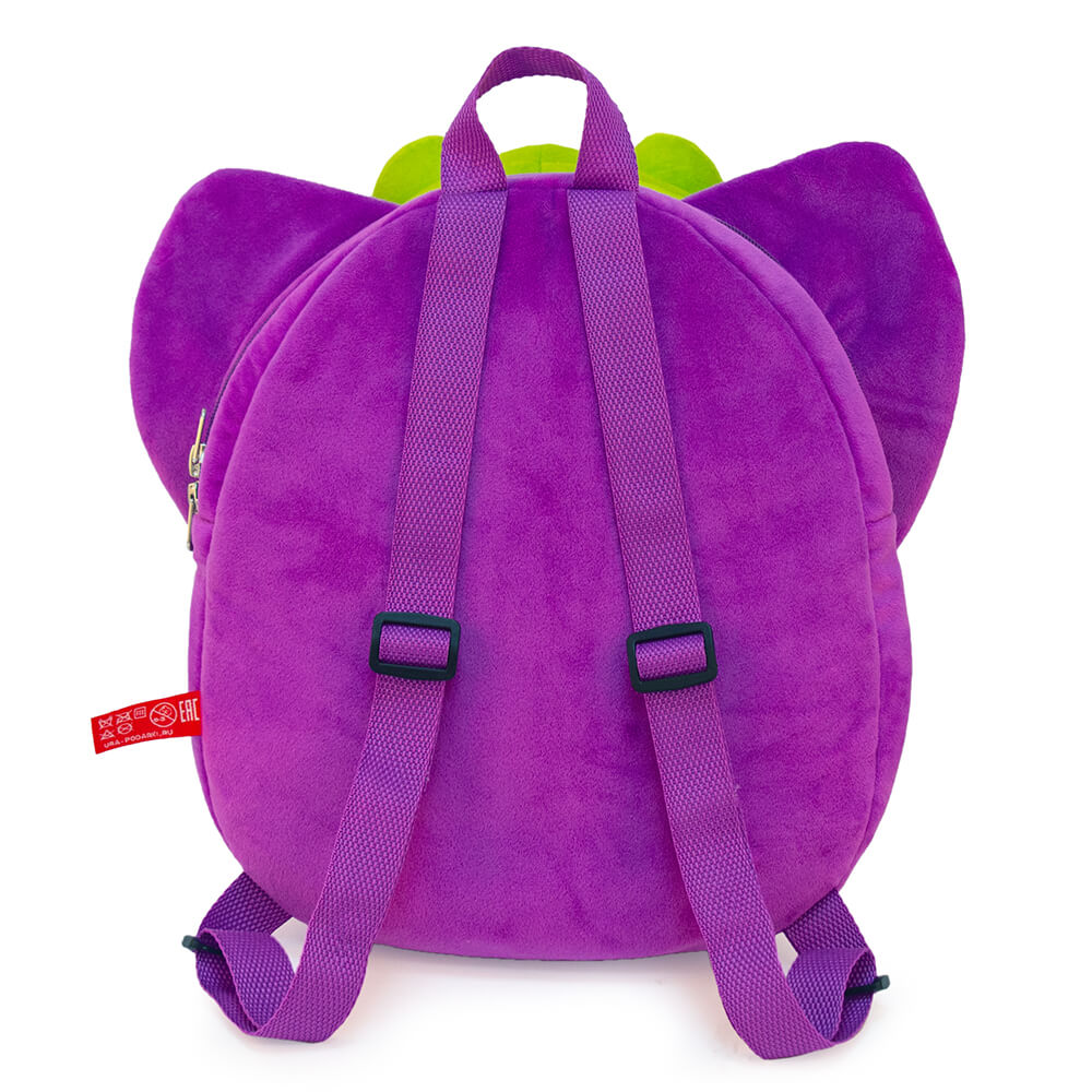 Рюкзак сшит из тактильно приятного плюша фиолетового цвета. Внутреннее отделение закрывается на молнию. Лямки можно регулировать по длине.