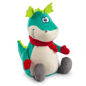 Дракончик Леонид в алом шарфике сшит из плюша мятно‑зеленого и молочно‑белого цветов, с ярко‑зелеными ушками и гребнем по спинке. На лапках у дракона красные варежки и серые валенки.