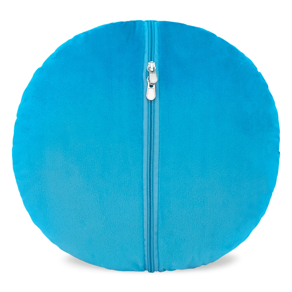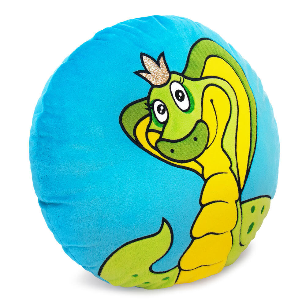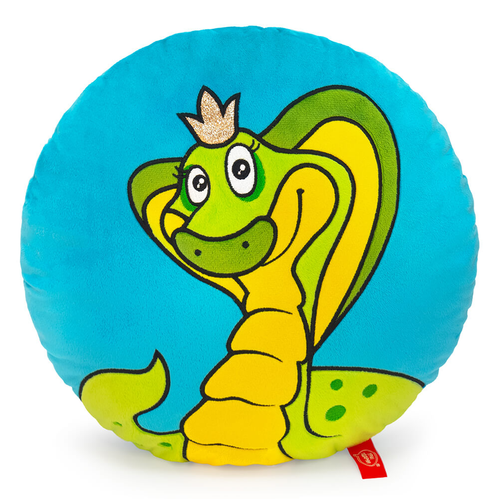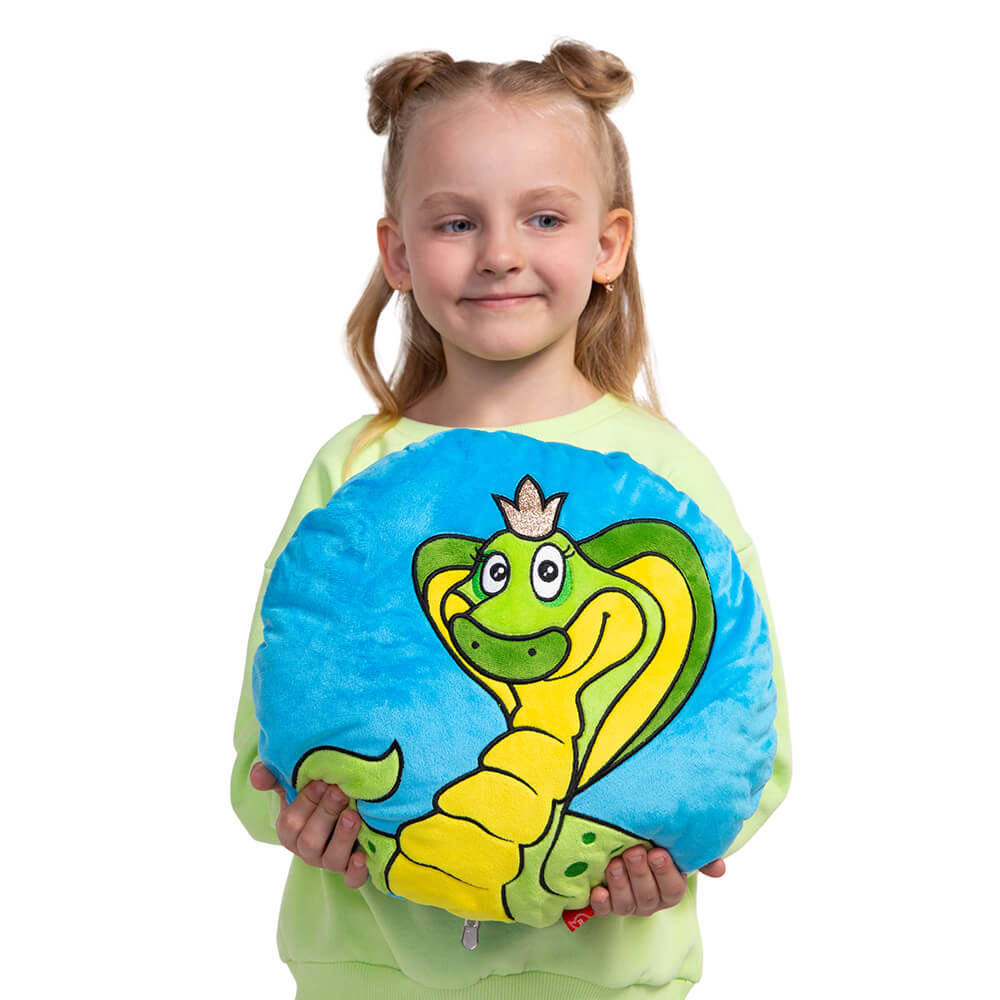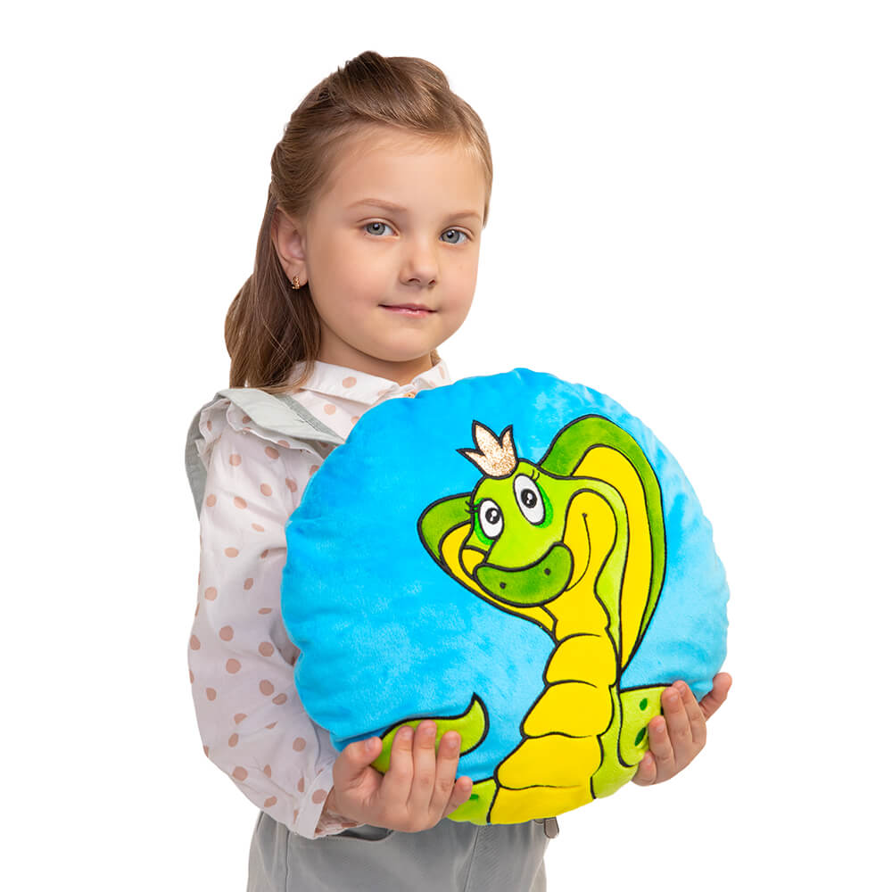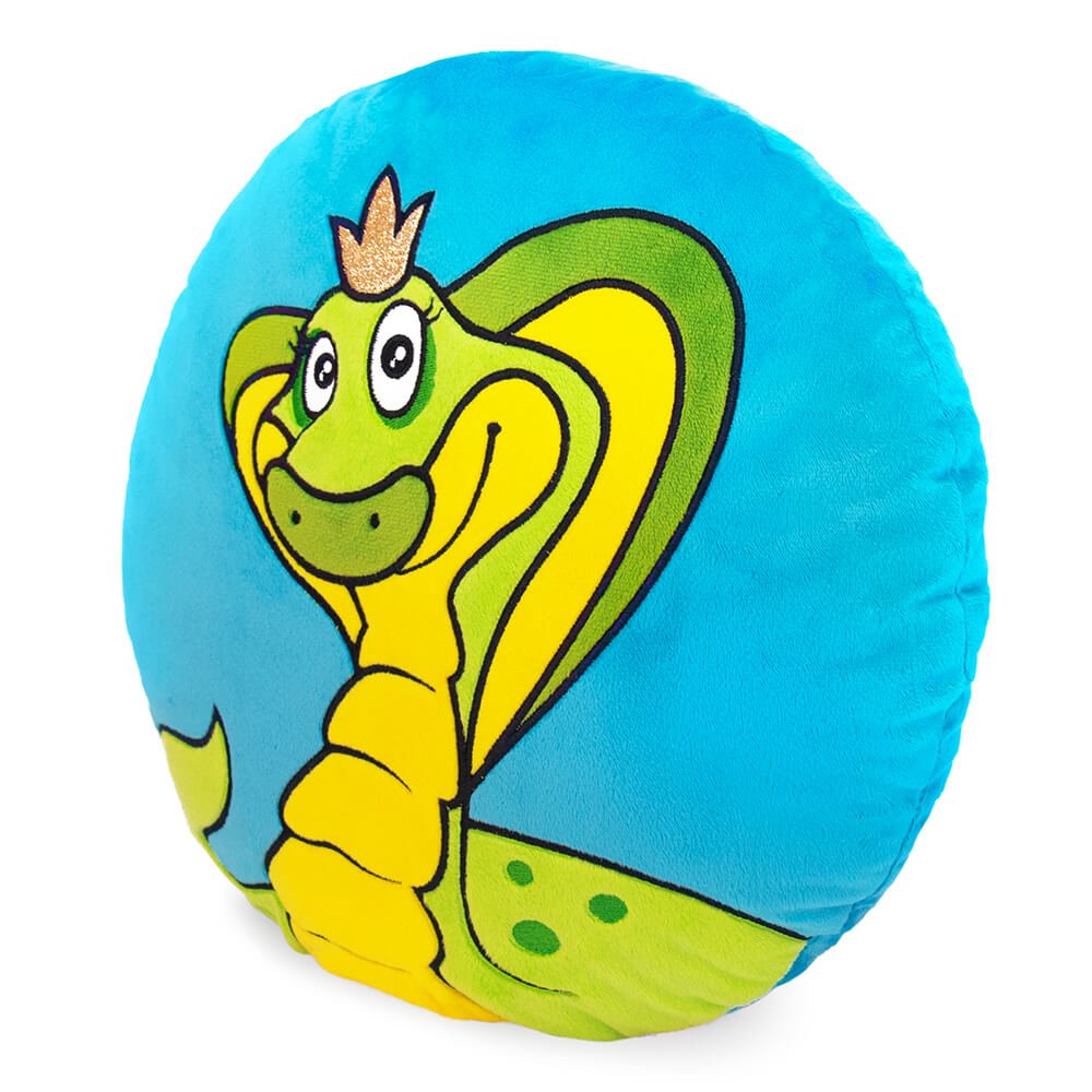 Круглая плюшевая подушка Каролина с красавицей змеей, выполненной в технике аппликации и вышивки. Подушка небесно-голубого цвета с оттенком бирюзы, царственная змея выполнена в желто-зеленых тонах. На голове у кобры ярко сверкающая корона из материала с глиттером.
