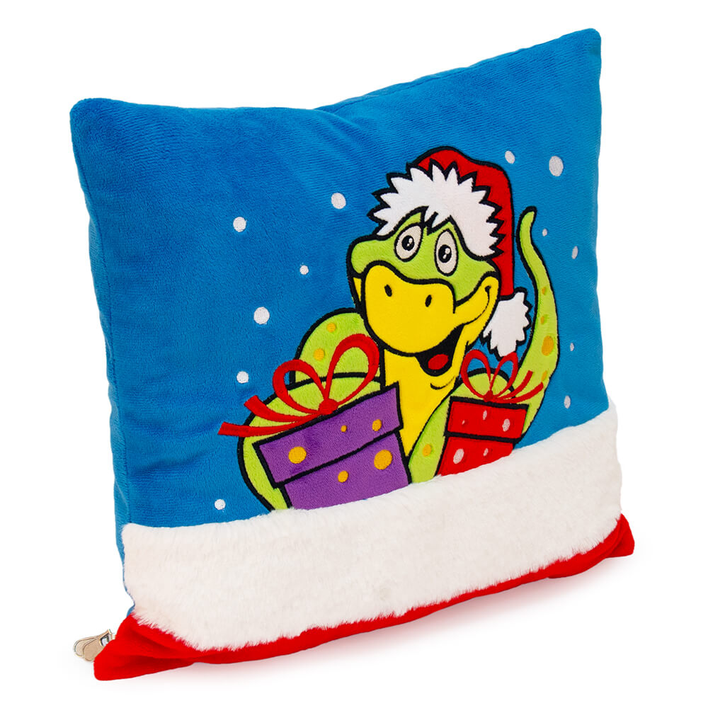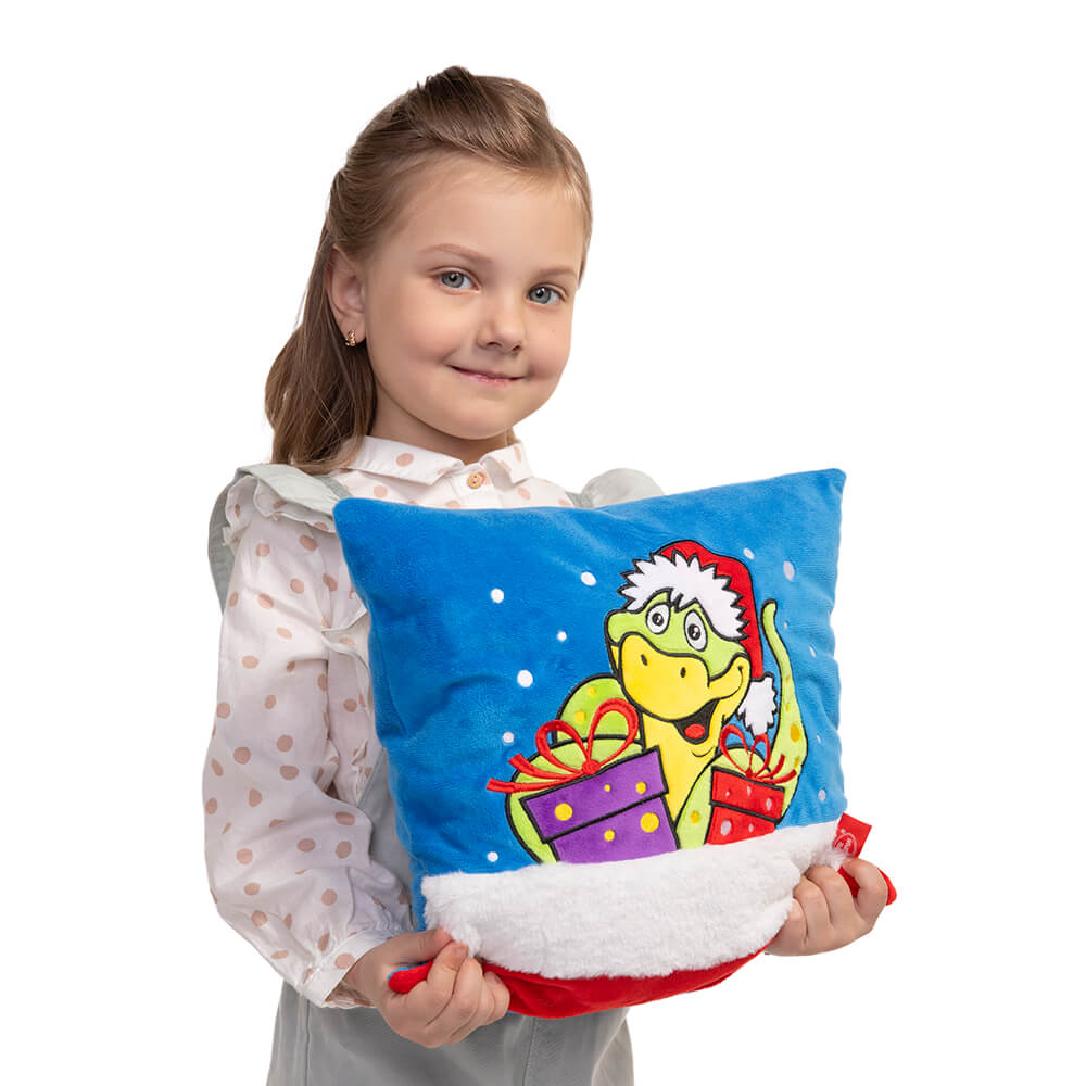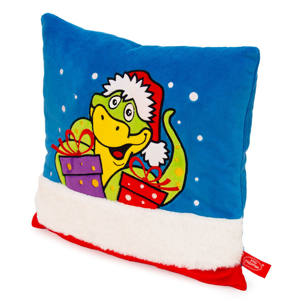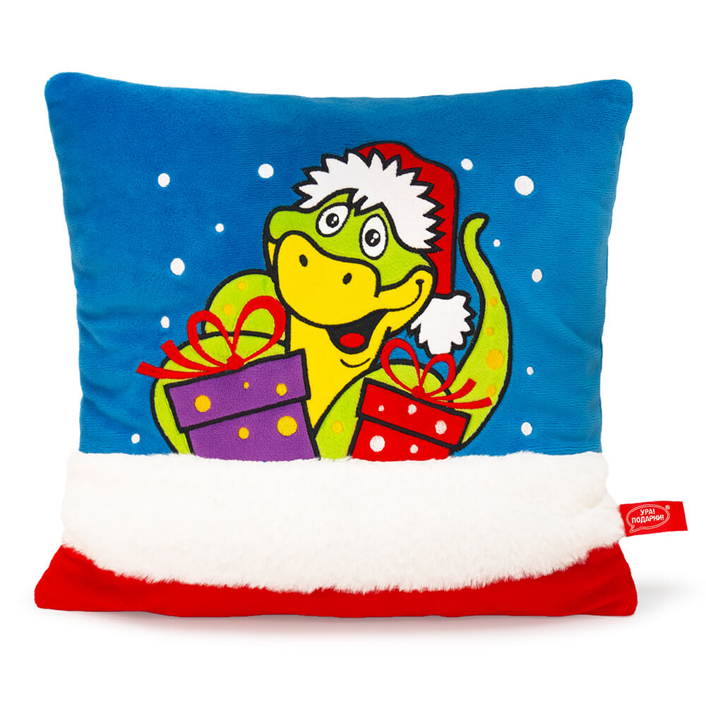 Забавный малыш в новогодней шапочке приносит удачу и подарки! Подушка Лаки сшита из мягкого нежного плюша темно-голубого цвета, по низу с красной полосой и оторочкой из белоснежного пушистого меха, как у мешка с подарками от Деда Мороза. Желто-зеленая змейка и яркие подарки выполнены в технике аппликации и вышивки.