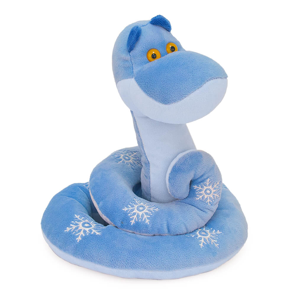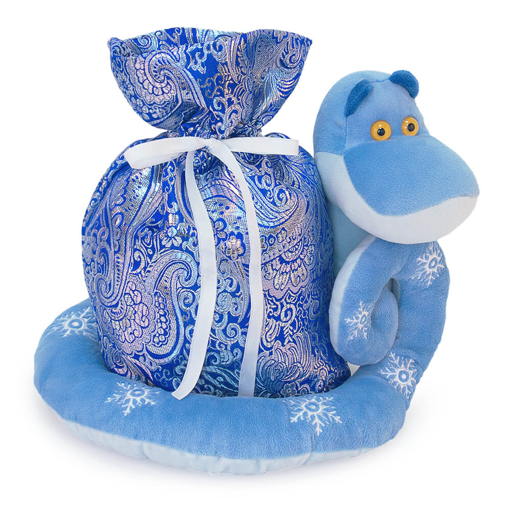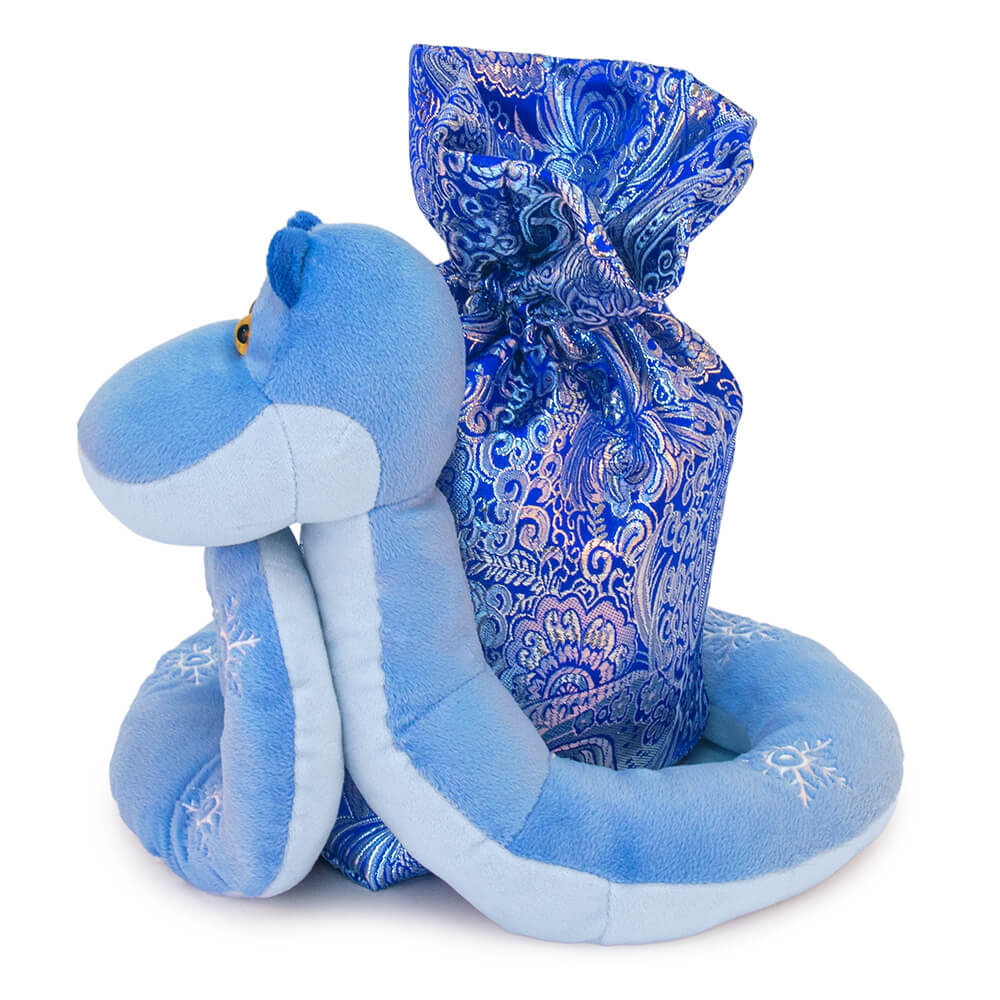 Текстильная игрушка змея Ронни, свернувшаяся клубком вокруг мешочка с конфетами. Змея сшита из мягкого плюша небесно- и нежно-голубого цветов, с темными ушками. Глаза у змейки пластиковые, янтарного цвета. На спинке вышиты белые снежинки.