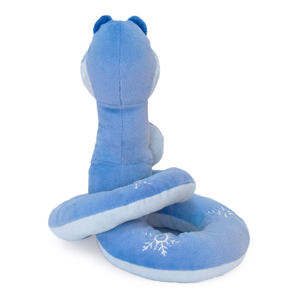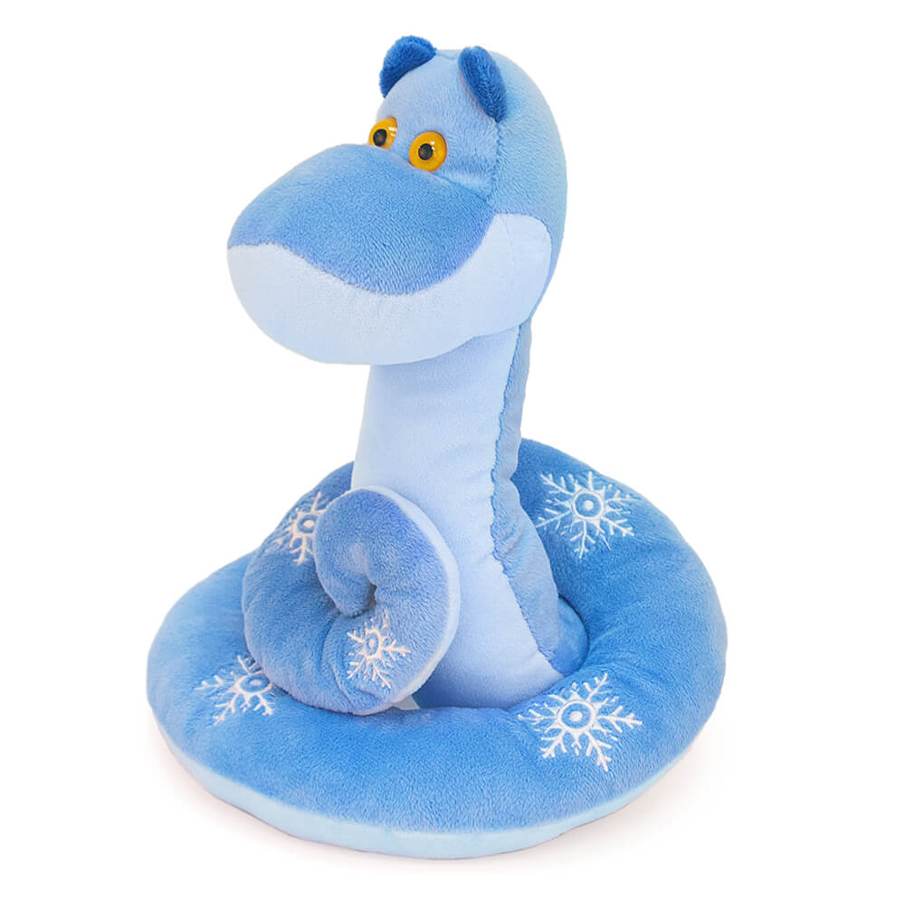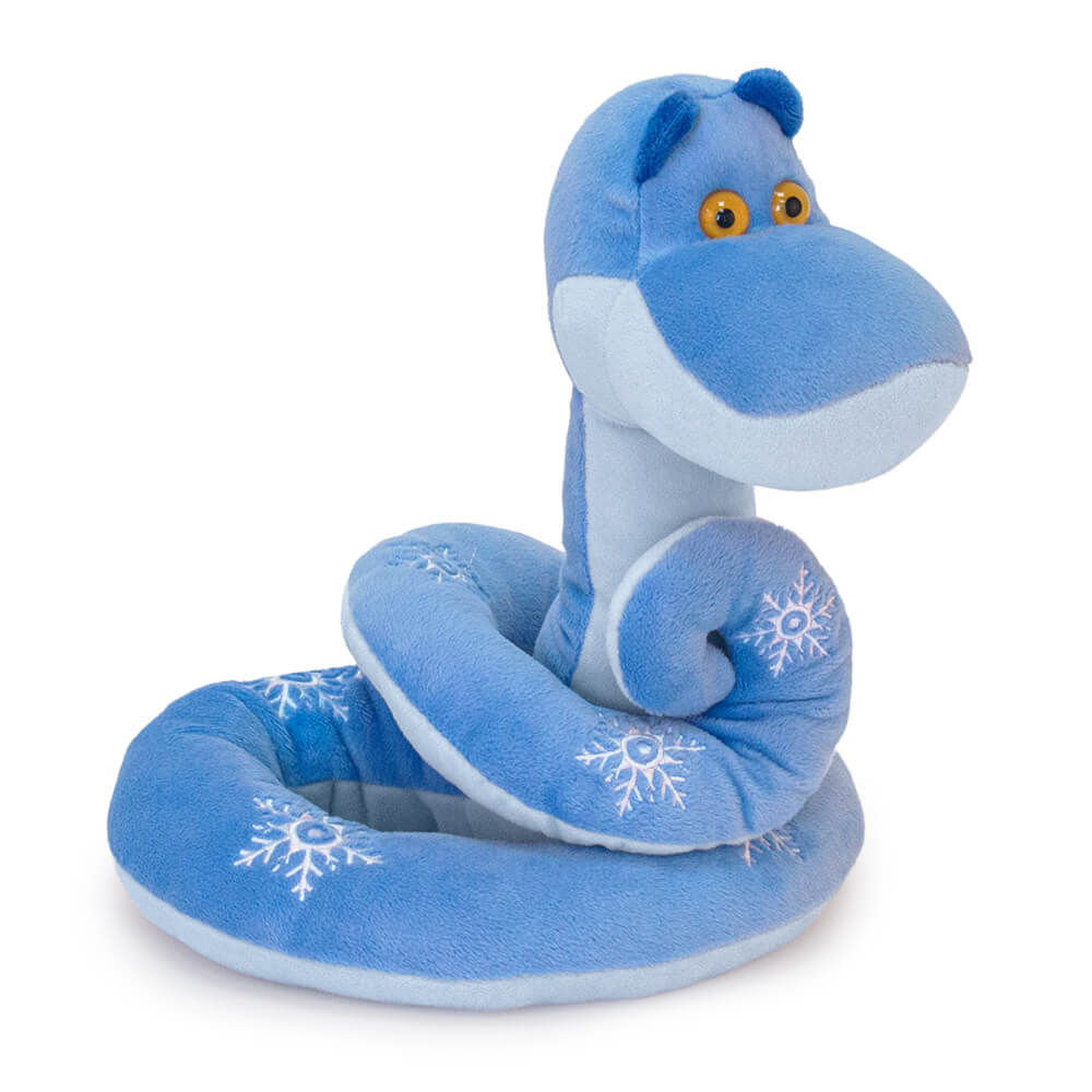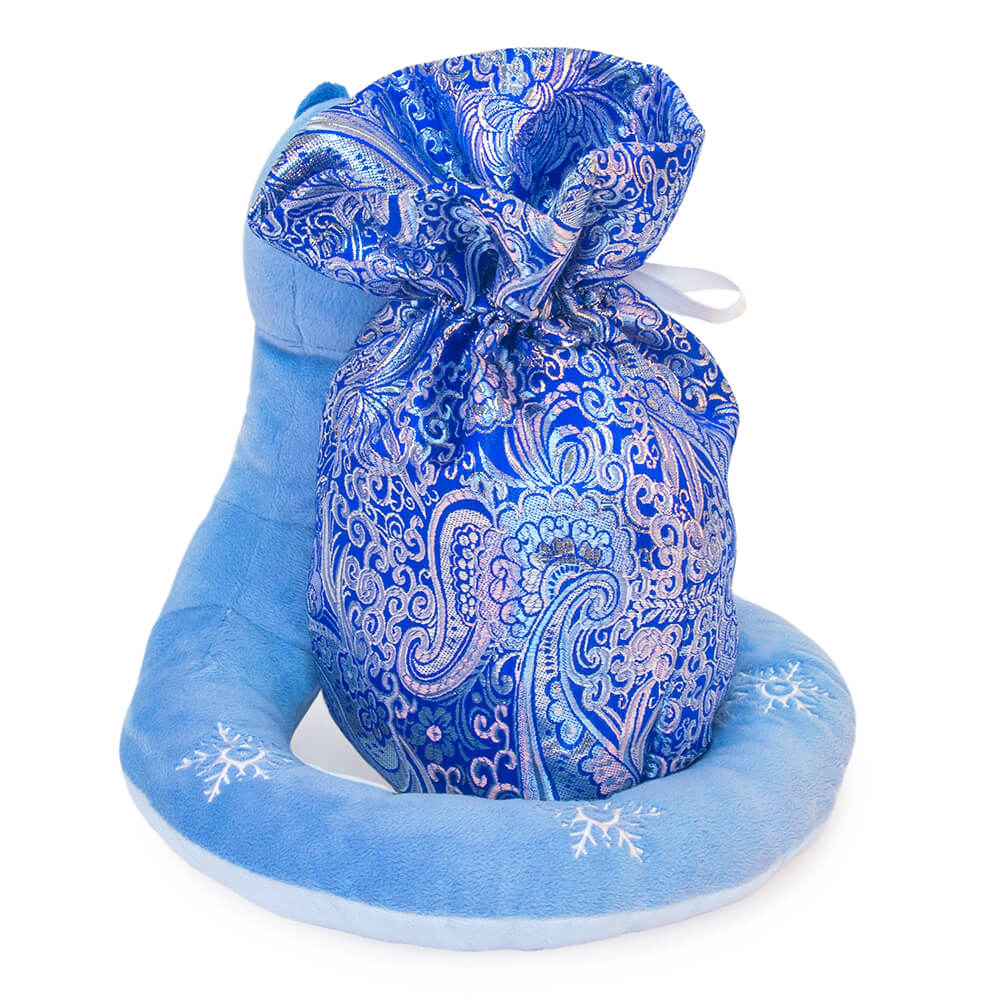 Текстильная игрушка змея Ронни, свернувшаяся клубком вокруг мешочка с конфетами. Змея сшита из мягкого плюша небесно- и нежно-голубого цветов, с темными ушками. Глаза у змейки пластиковые, янтарного цвета. На спинке вышиты белые снежинки.