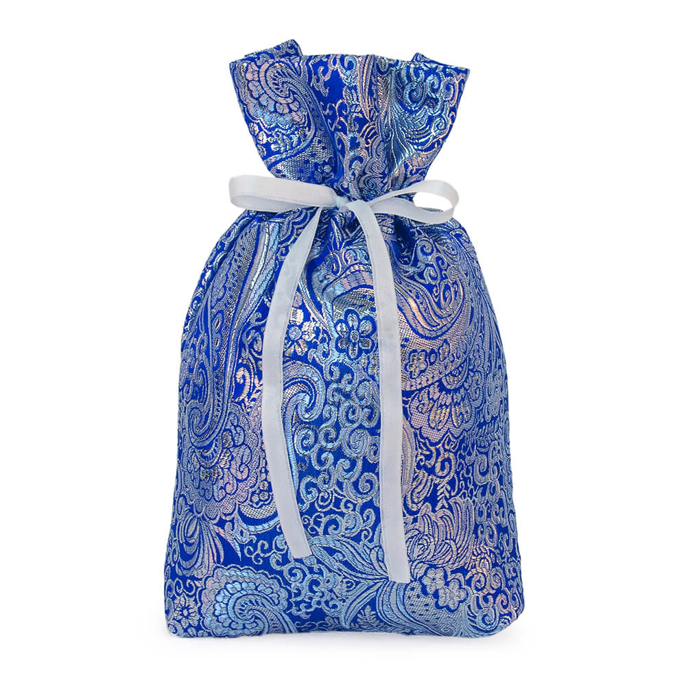 Синий текстильный мешок украшают сказочные узоры в серебристом цвете. Мешочек стягивается белоснежной лентой. Внутри сладкий подарок 1000г Премиум.