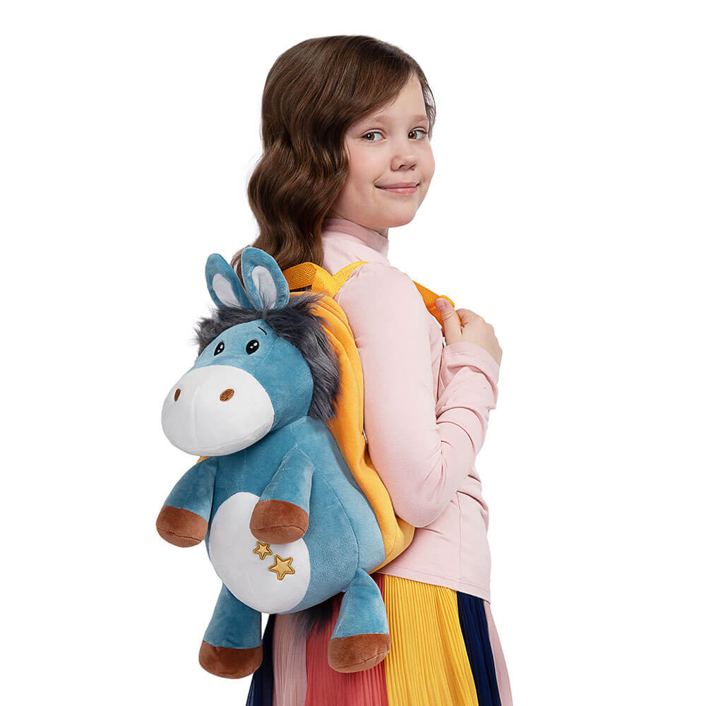 Мягкий рюкзак Лошадь Ирбис сшит из мягкого софта оранжевого цвета. Рюкзак держит Ирбис красивого синего оттенка. Внутреннее отделение рюкзака закрывается на молнию. Лямки можно регулировать по длине.